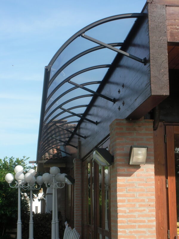 La copertura delle tettoie o pensiline è realizzata in policarbonato compatto, molto resistente a urti (più di un vetro) e resistente anche alla grandine, al carico neve e addirittura al fuoco. Queste soluzioni in policarbonato compatto sta sostituendo il vetro e il plexiglas, grazie alla sua robustezza ed efficacia. Il policarbonato si può scegliere in diverse colorazioni: