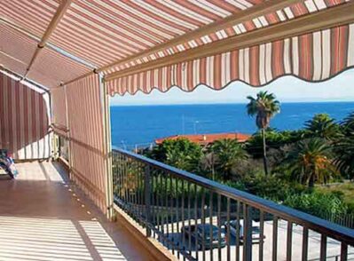 Il tessuto possono essere in Acrilico o anche in PVC, scorre nella parte interna delle guide e permette l’apertura del telo fino a terra chiudendo cosi la parte frontale della struttura per avere un può di privacy.